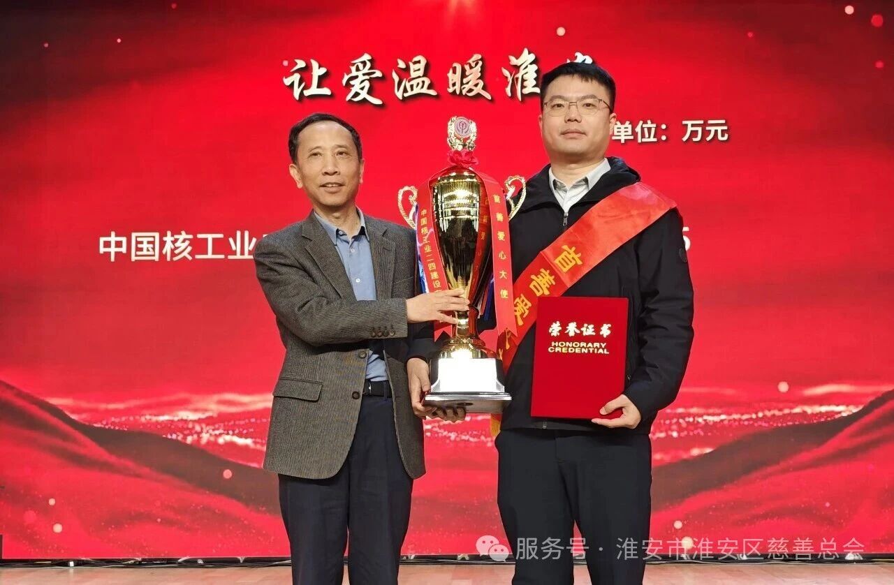市人大常委会副主任范更生为2026年淮安区“元旦慈善一日捐”捐赠145万元的中国核工业二四建设有限公司华东分公司副总经理黄怀涛披绶带,颁发证书和“首善”奖杯,并合影留念。元月1日上午,淮安区新安小学河...