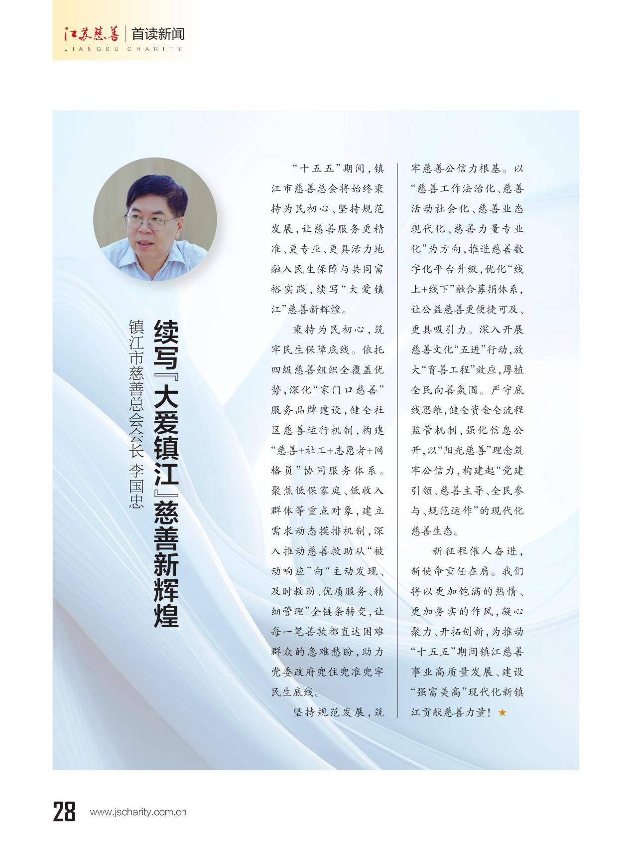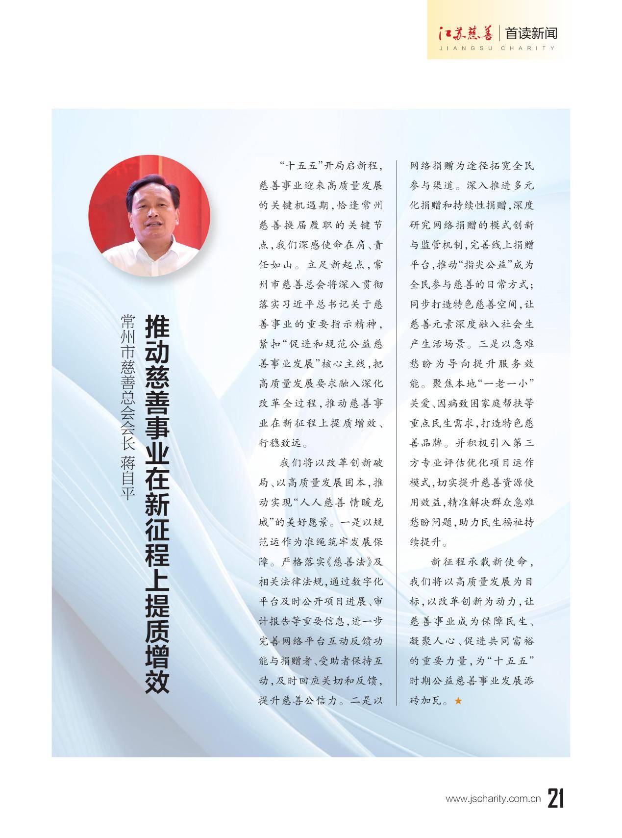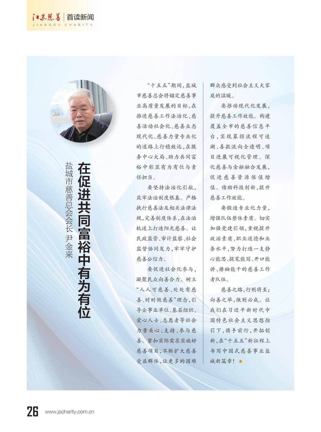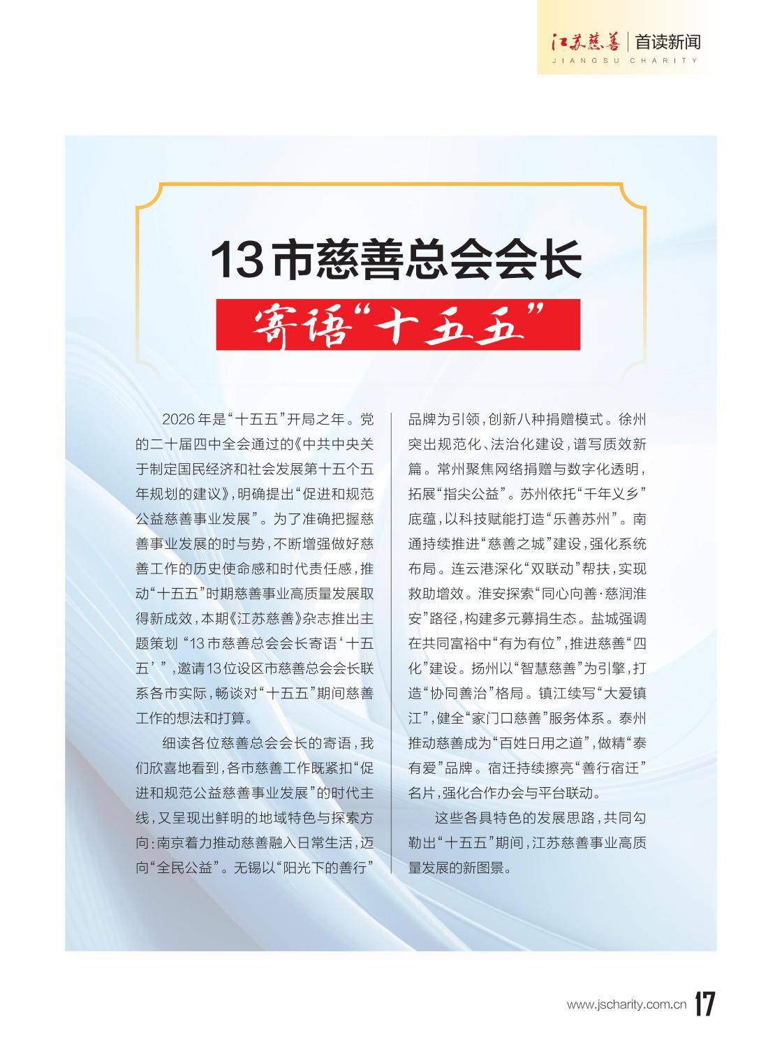 本期《江苏慈善》杂志推出主题策划"13市慈善总会会长寄语‘十五五’”,邀请13位设区市慈善总会会长联系各市实际,畅谈对“十五五”期间慈善工作的想法和打算。