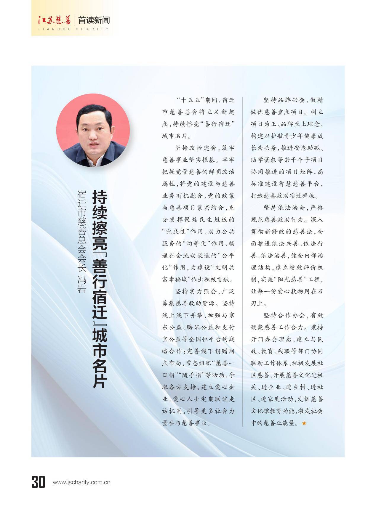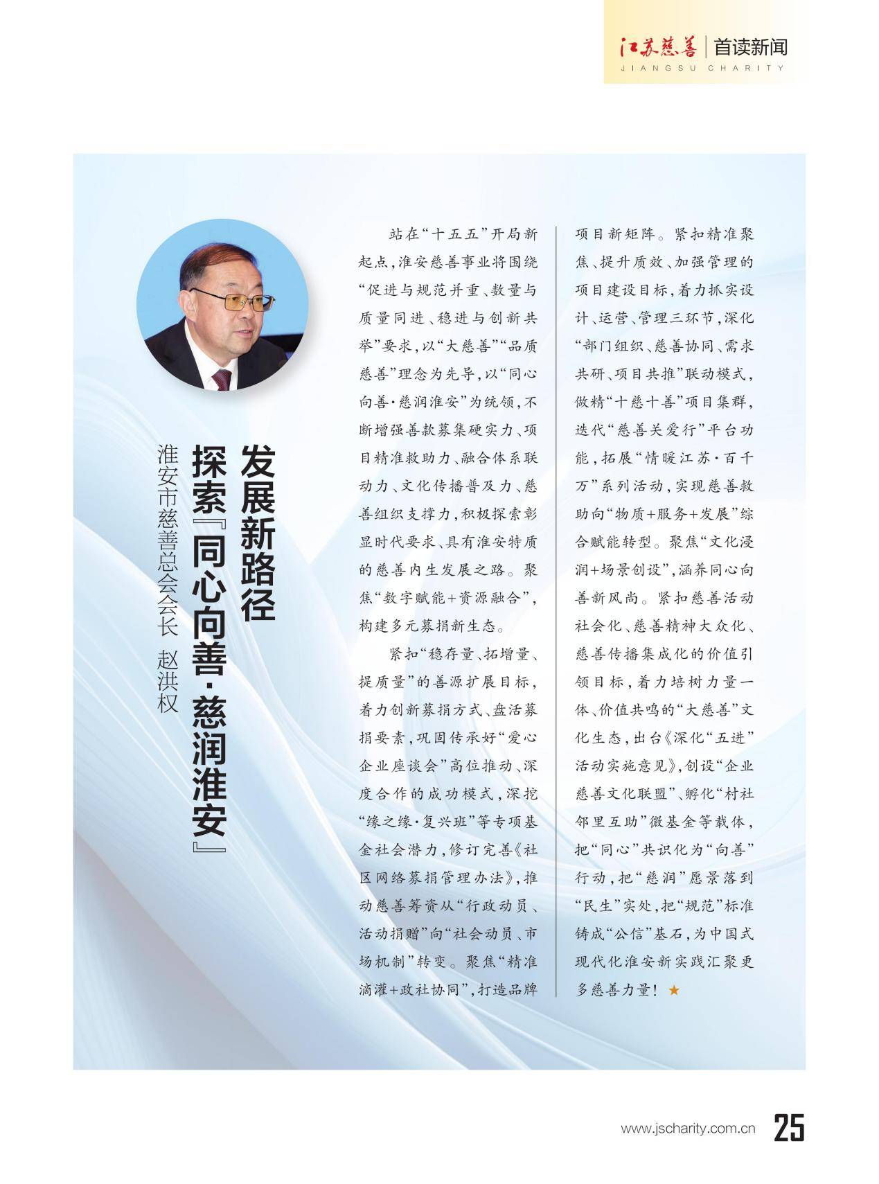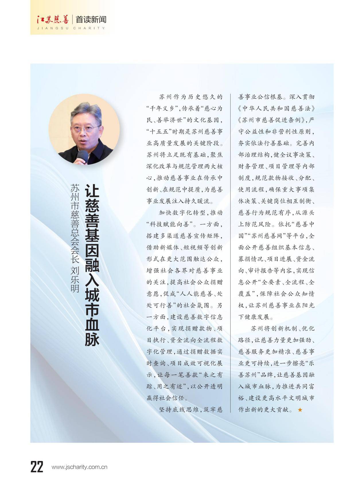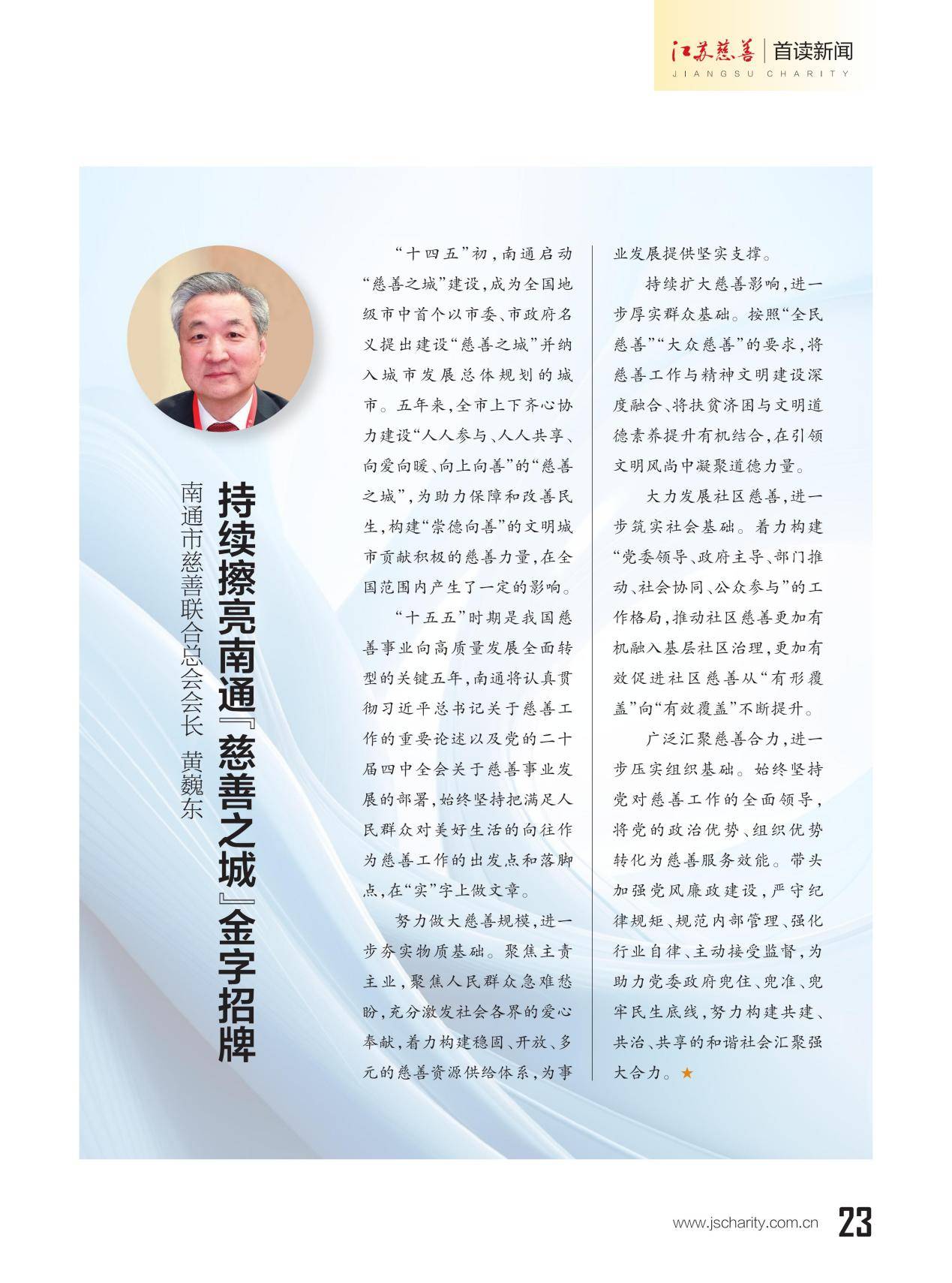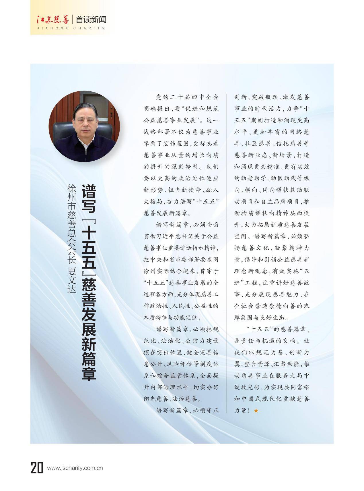 本期《江苏慈善》杂志推出主题策划"13市慈善总会会长寄语‘十五五’”,邀请13位设区市慈善总会会长联系各市实际,畅谈对“十五五”期间慈善工作的想法和打算。