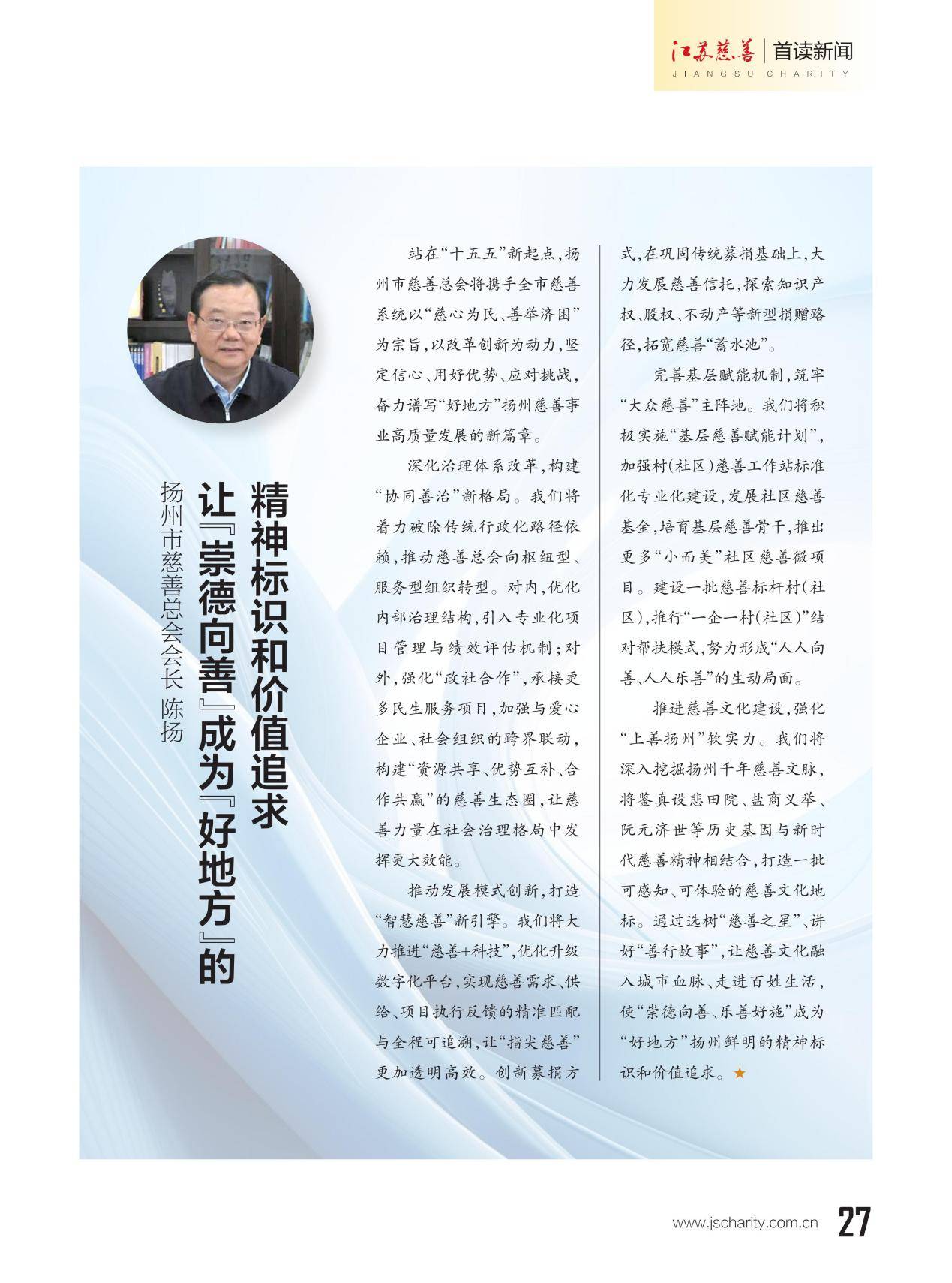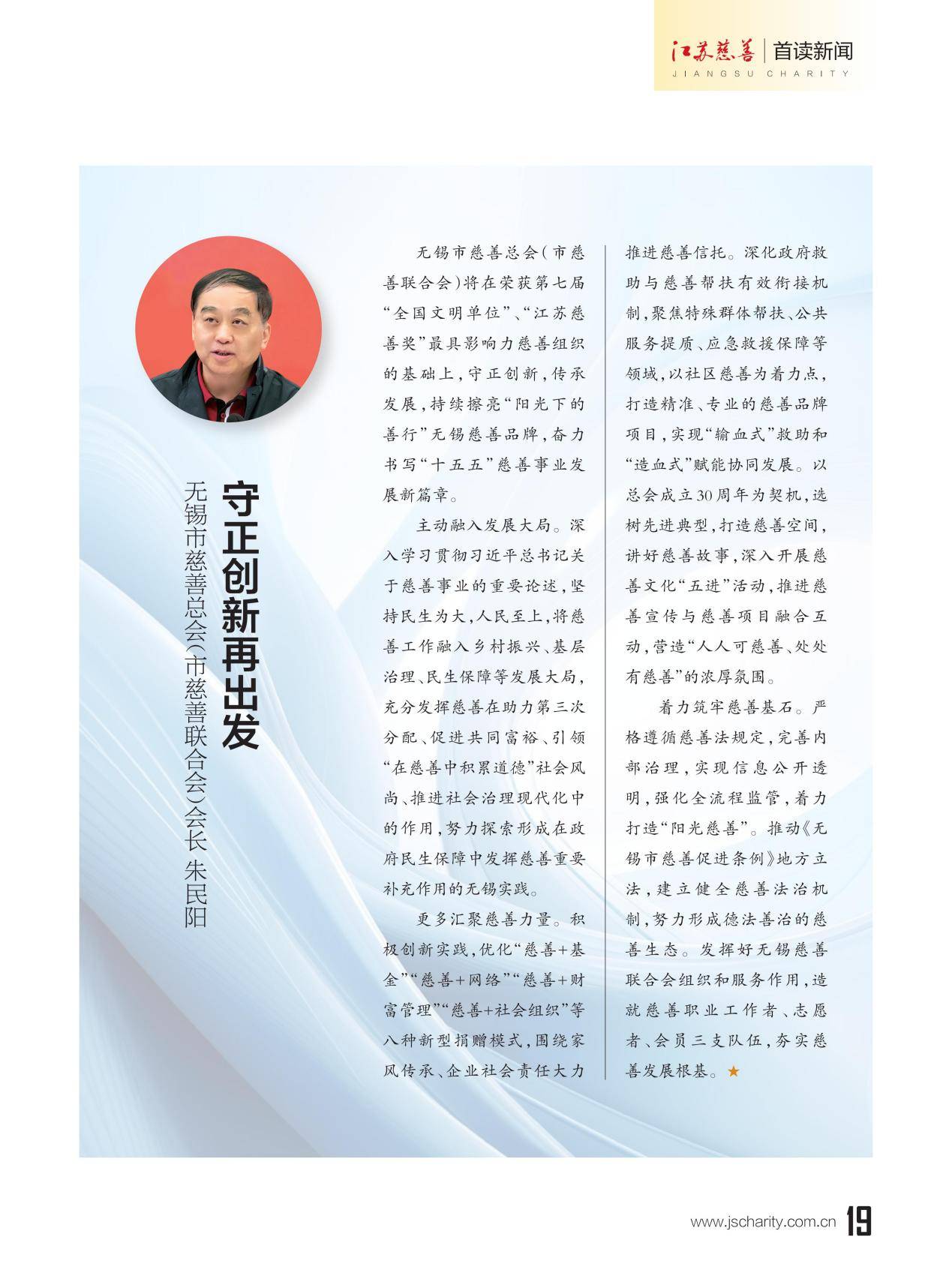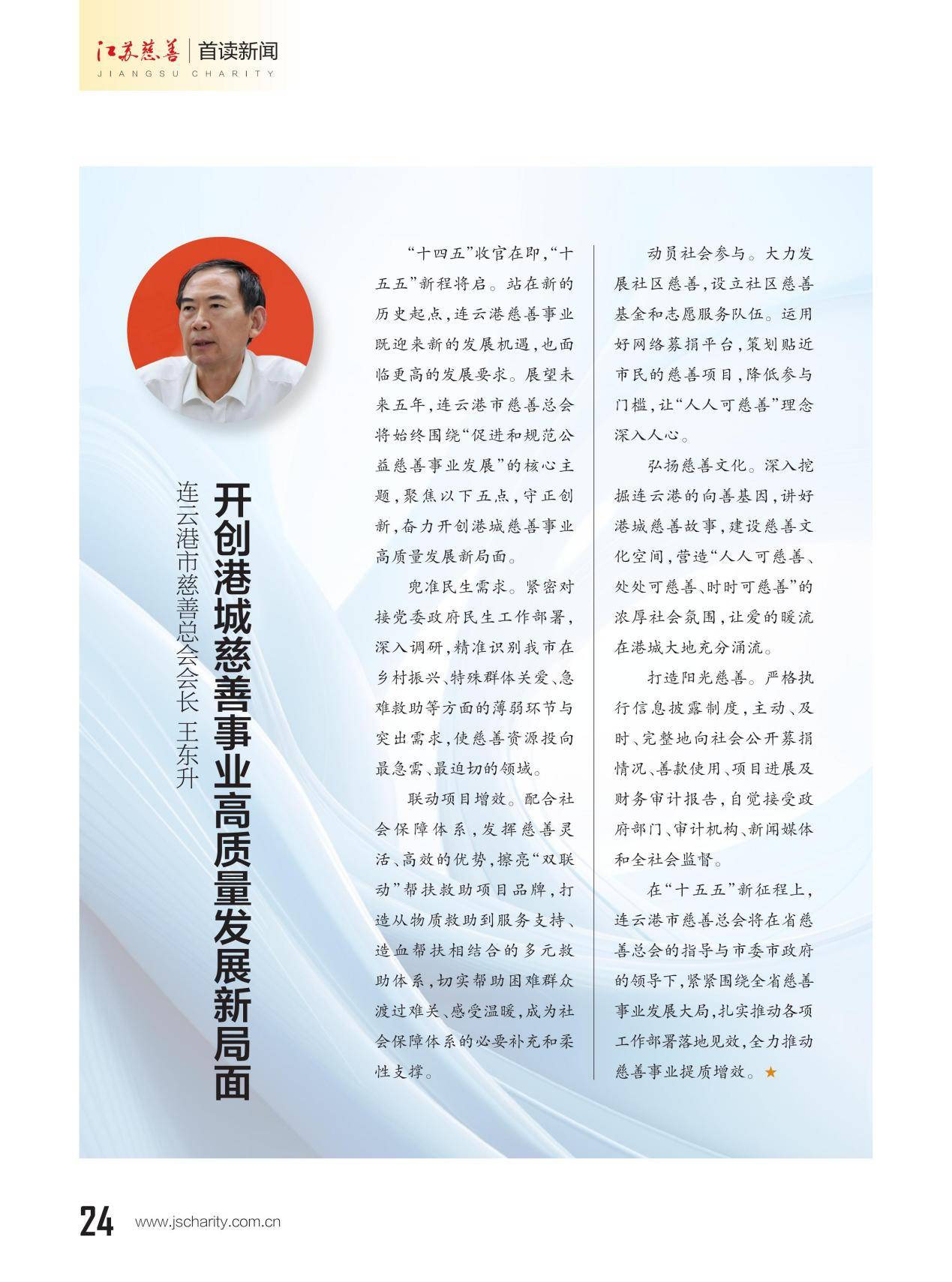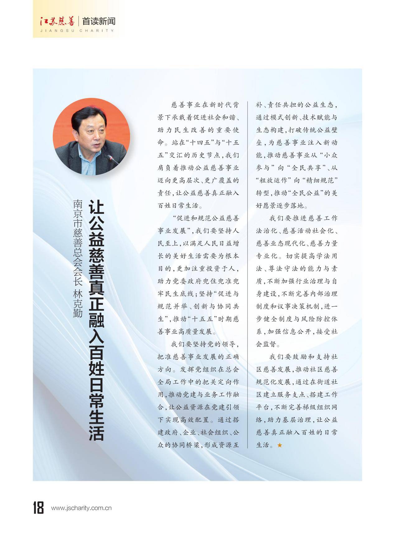 本期《江苏慈善》杂志推出主题策划"13市慈善总会会长寄语‘十五五’”,邀请13位设区市慈善总会会长联系各市实际,畅谈对“十五五”期间慈善工作的想法和打算。
